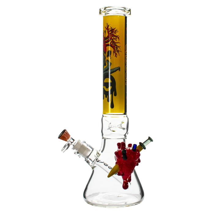 The Cheech 15″ 7mm Pierce Your Heart Beaker combines bold artistry with robust glasswork to create a standout piece for any glass collection. With a sculpted pierced heart embedded into the chamber and vibrant artwork along the tube, this bong delivers both visual impact and excellent performance. Its thick 7mm build ensures long-lasting durability and smoother draws with reliable stability.